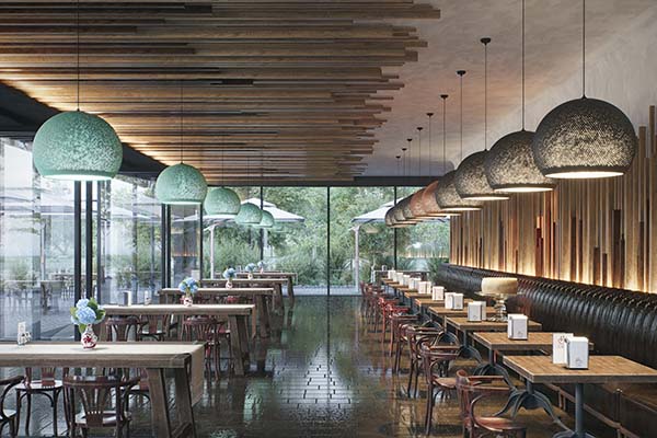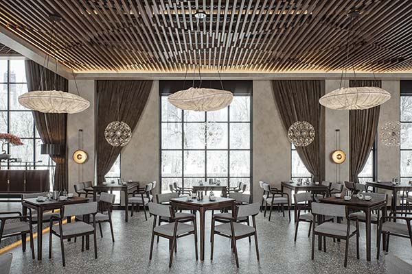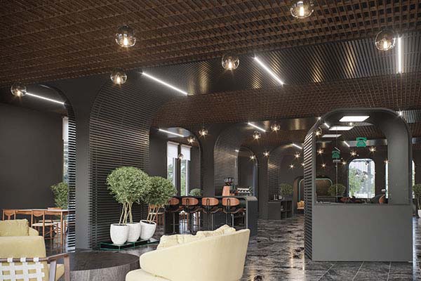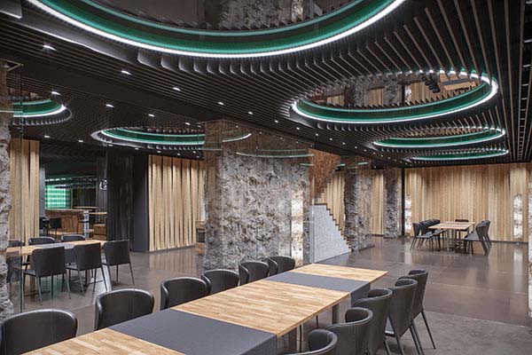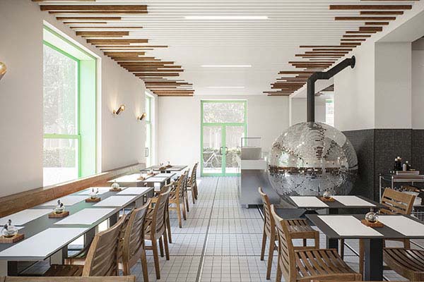 Лаконічний дизайн: креативна рейкова стеля у піцерії (+6 фото)