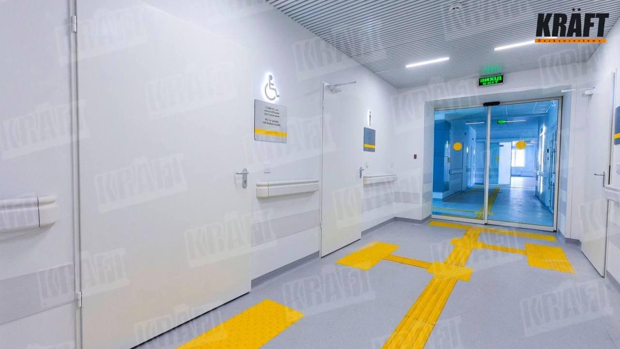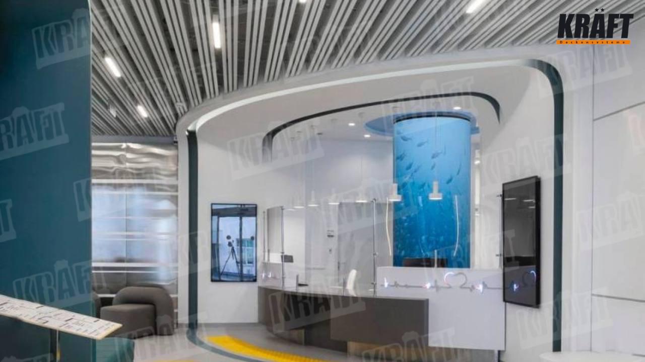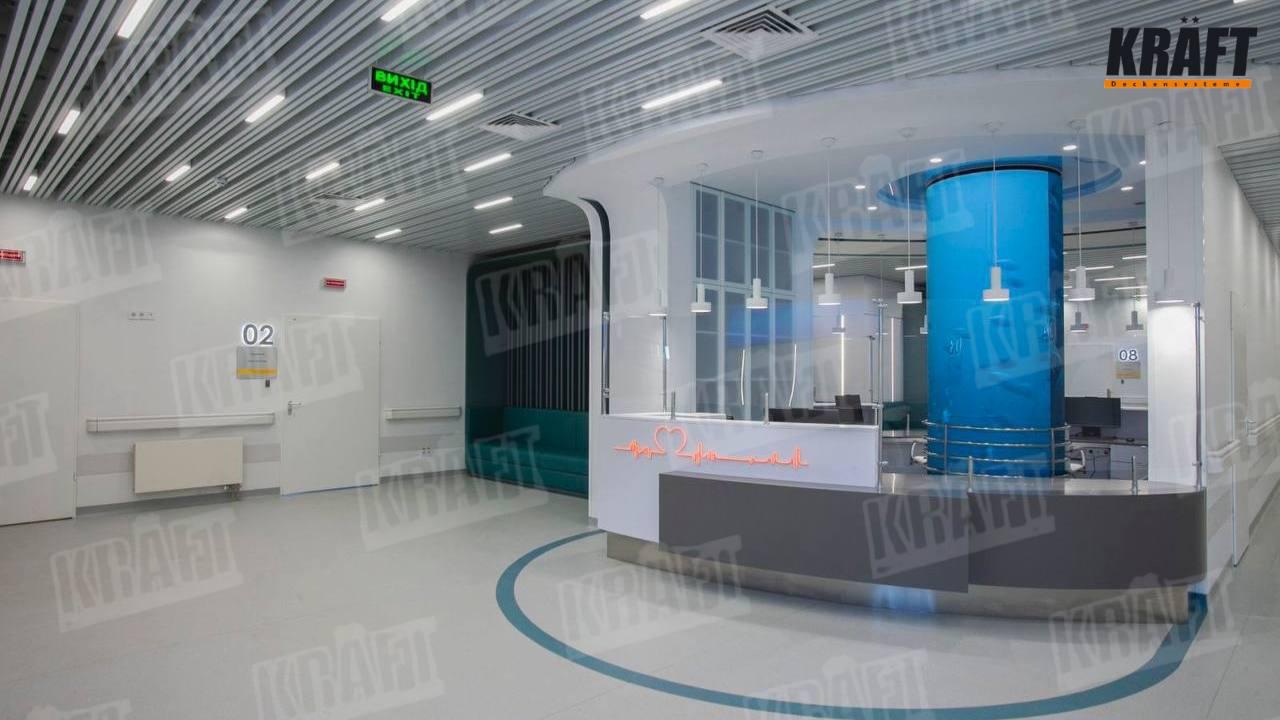 Приймальне відділення — це перший контакт пацієнта з лікарнею. Саме тому його оформлення має бути водночас організованим, доступним і психологічно комфортним. У цьому випадку архітектори обрали рейкову стелю KRAFT 35×85 мм, яка відмінно впоралася з цим завданням. Завдяки своїй геометрії й лаконічному вигляду, вона додає простору ритму та чистоти — візуальної й функціональної.