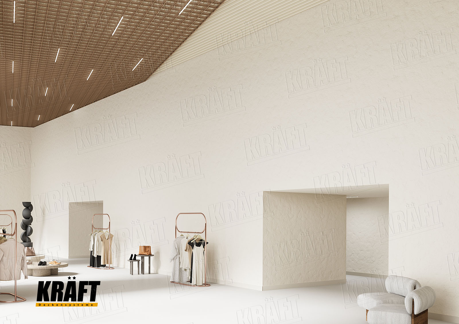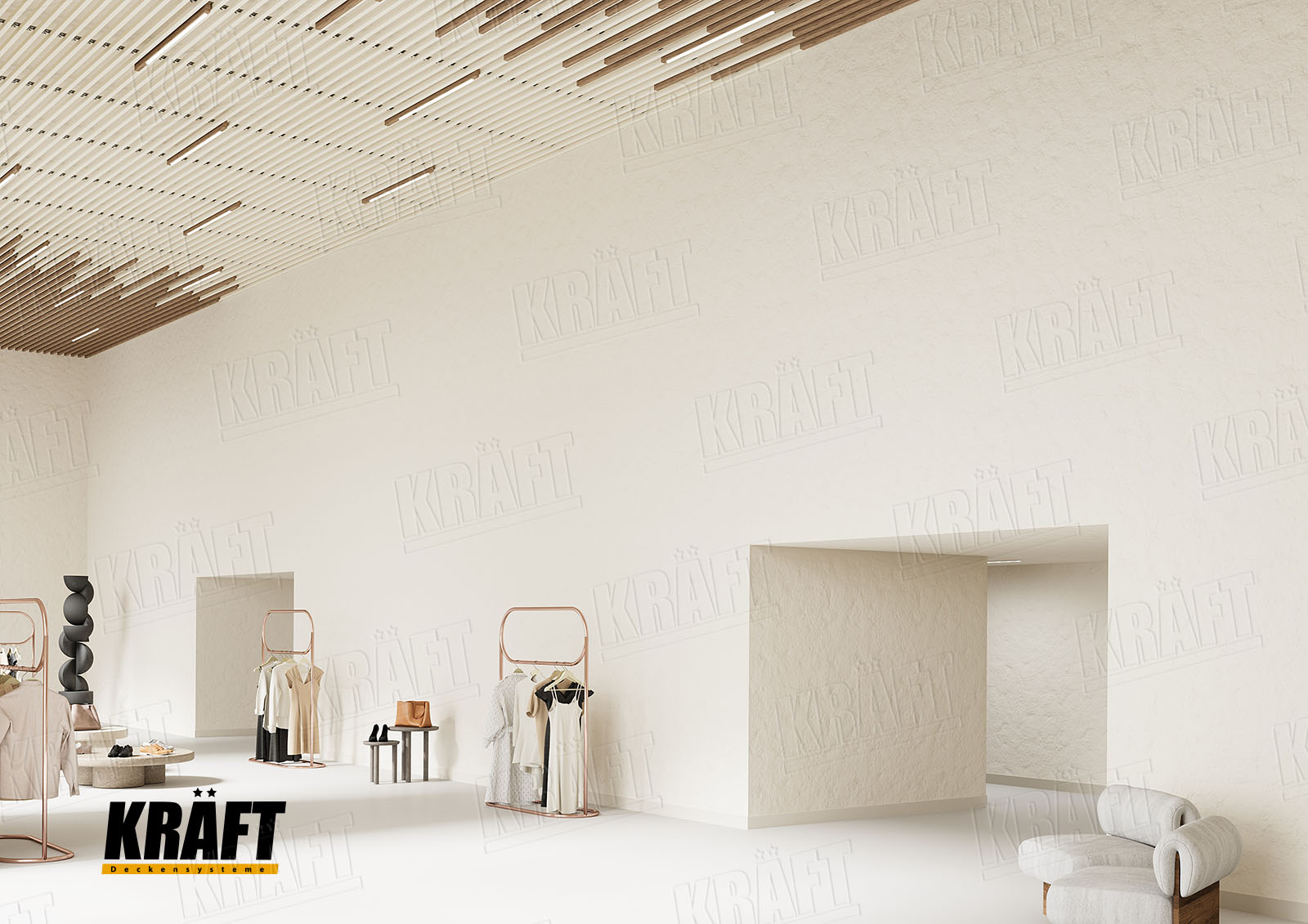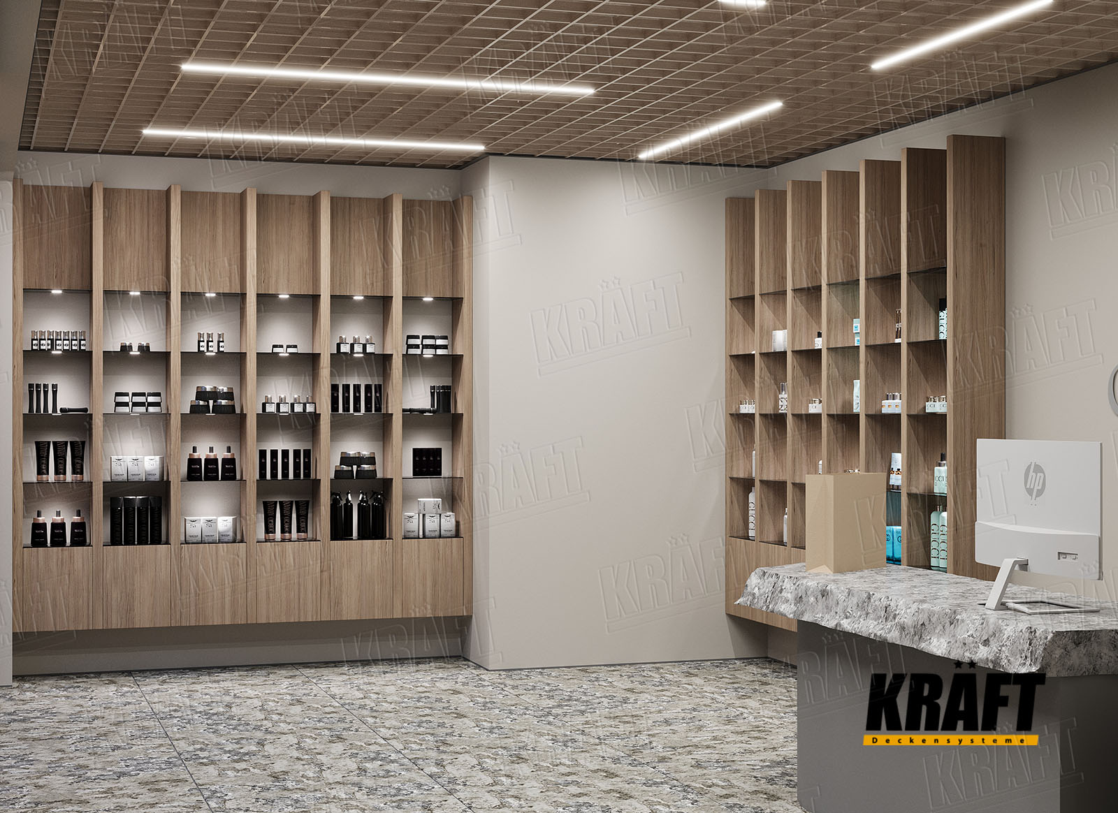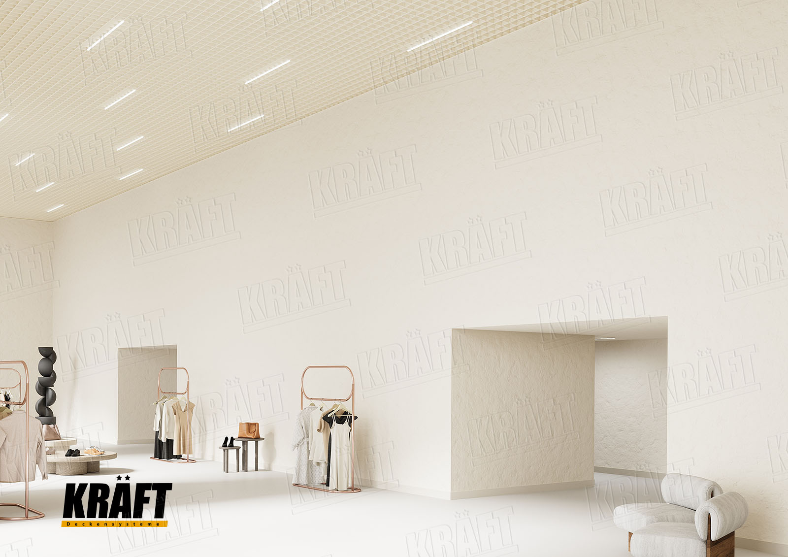 Окремо варто відзначити можливість комбінувати різні види підвісних стель KRAFT в одному інтер’єрі. Таке рішення дозволяє не тільки зонувати простір і акцентувати увагу на певних ділянках, а й ефективно вирішувати технічні завдання. Наприклад, в основному торговому залі можна використовувати прозору рейкову стелю або стелю грильято, які забезпечують необхідну вентиляцію та пожежну безпеку, а над касовою зоною чи примірочними — акустичну стелю для зниження шуму. Панелі з просічно-витяжної сітки KRAFT Mesh чудово підходять для оформлення декоративних вставок, створення підвісних острівців або нестандартних дизайнерських акцентів. Грамотне поєднання різних систем дозволяє зробити інтер’єр магазину не лише функціональним, а й ефектним, таким, що відповідає сучасним вимогам безпеки та комфорту.