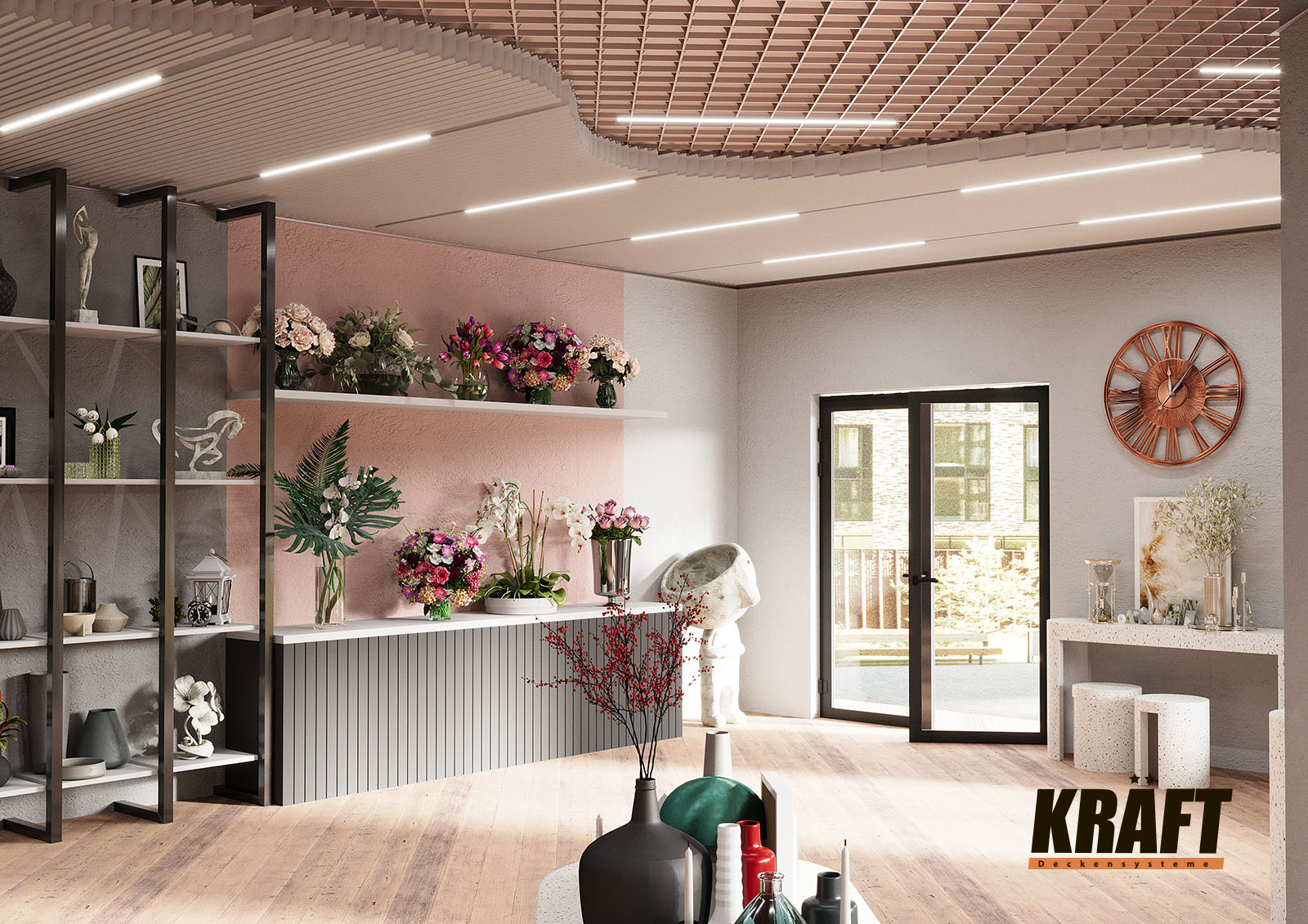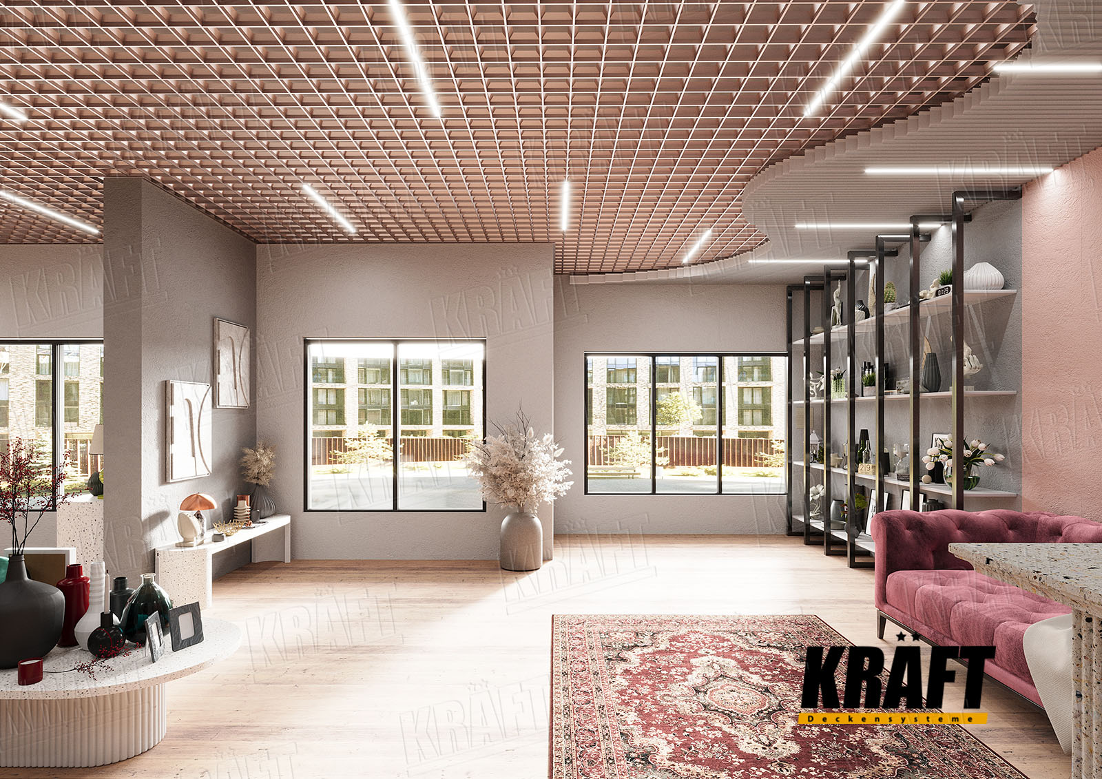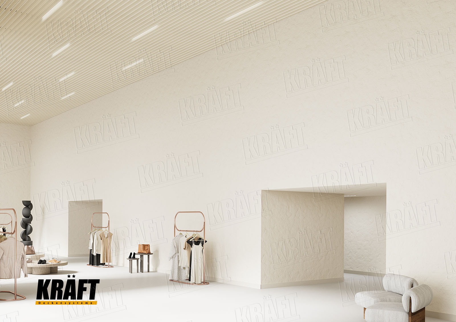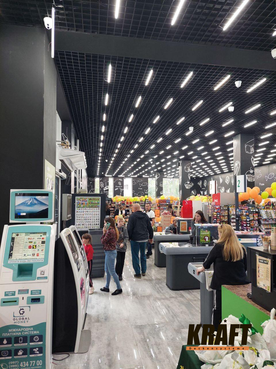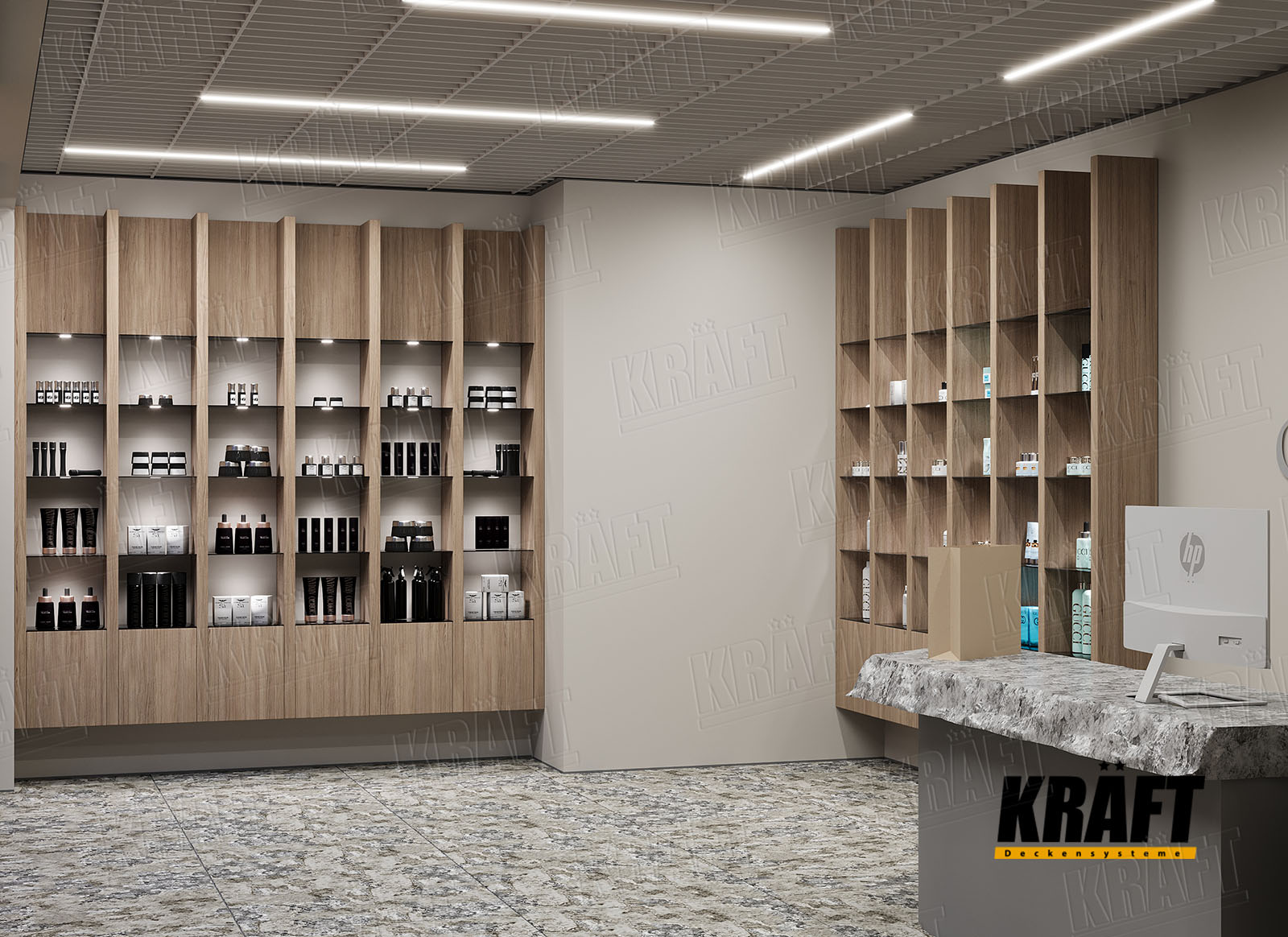 Окремо варто відзначити можливість комбінувати різні види підвісних стель KRAFT в одному інтер’єрі. Таке рішення дозволяє не тільки зонувати простір і акцентувати увагу на певних ділянках, а й ефективно вирішувати технічні завдання. Наприклад, в основному торговому залі можна використовувати прозору рейкову стелю або стелю грильято, які забезпечують необхідну вентиляцію та пожежну безпеку, а над касовою зоною чи примірочними — акустичну стелю для зниження шуму. Панелі з просічно-витяжної сітки KRAFT Mesh чудово підходять для оформлення декоративних вставок, створення підвісних острівців або нестандартних дизайнерських акцентів. Грамотне поєднання різних систем дозволяє зробити інтер’єр магазину не лише функціональним, а й ефектним, таким, що відповідає сучасним вимогам безпеки та комфорту.