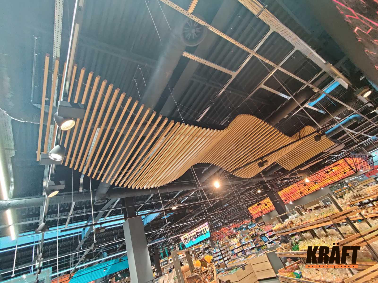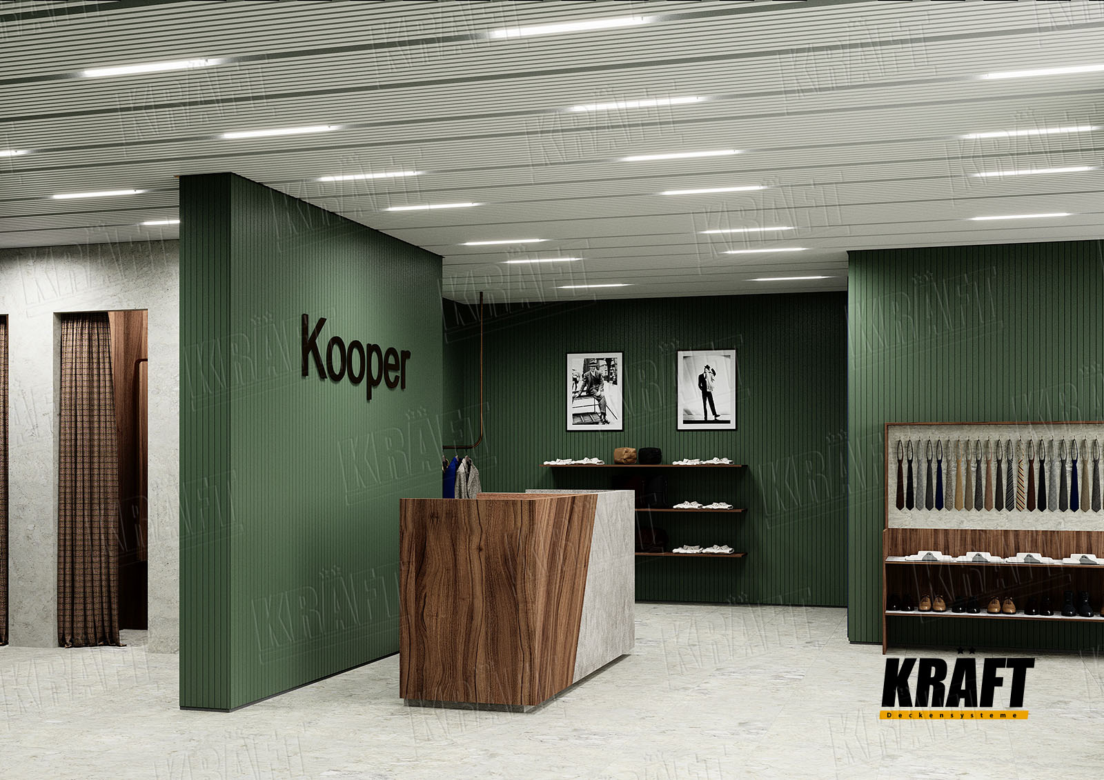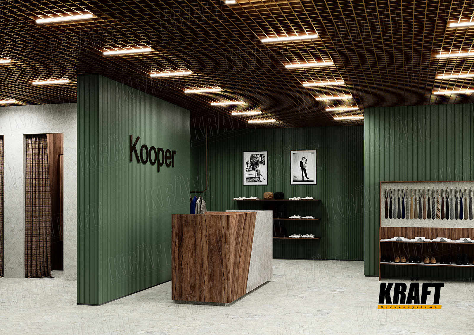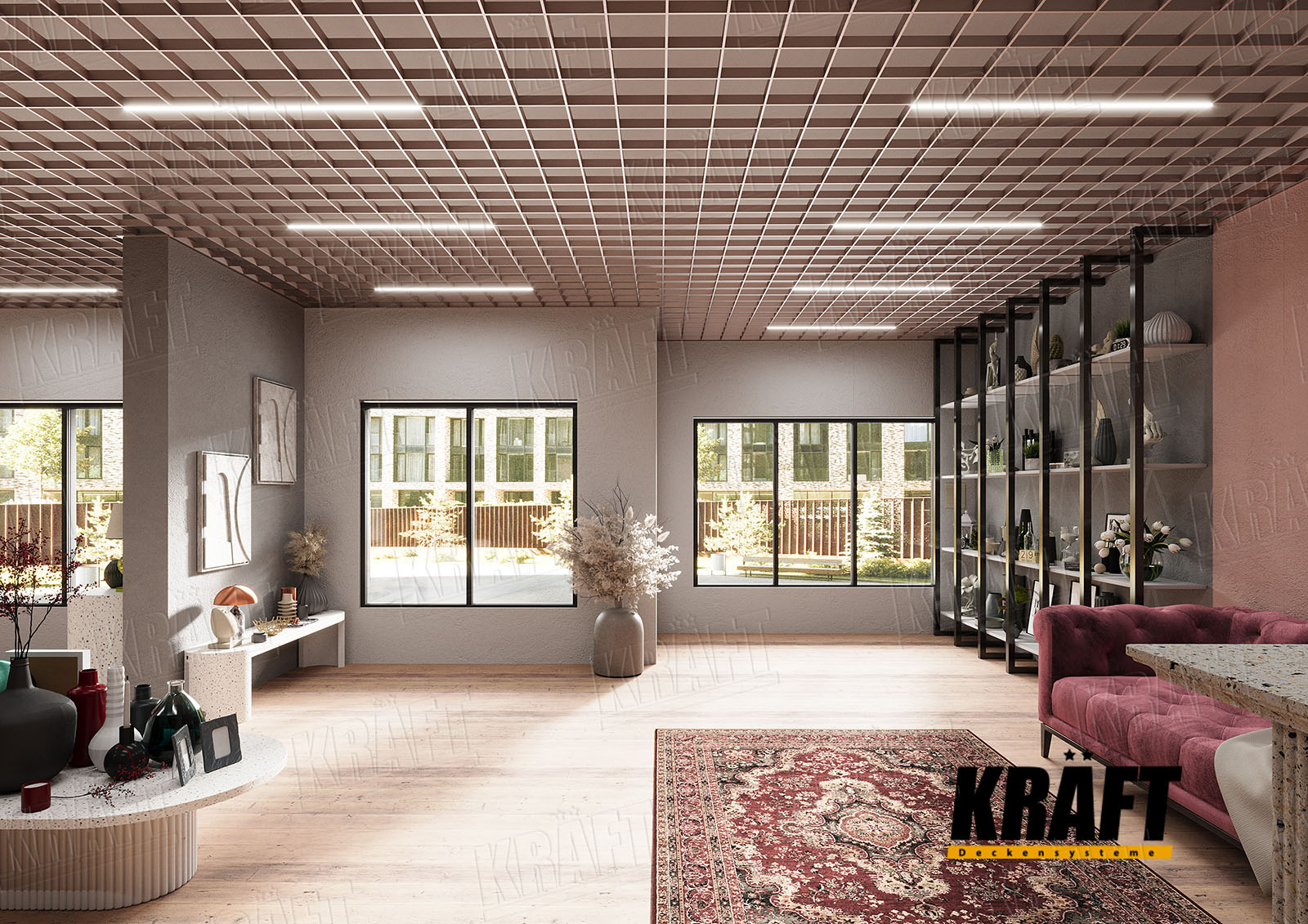 Окремо варто відзначити можливість комбінувати різні види підвісних стель KRAFT в одному інтер’єрі. Таке рішення дозволяє не тільки зонувати простір і акцентувати увагу на певних ділянках, а й ефективно вирішувати технічні завдання. Наприклад, в основному торговому залі можна використовувати прозору рейкову стелю або стелю грильято, які забезпечують необхідну вентиляцію та пожежну безпеку, а над касовою зоною чи примірочними — акустичну стелю для зниження шуму. Панелі з просічно-витяжної сітки KRAFT Mesh чудово підходять для оформлення декоративних вставок, створення підвісних острівців або нестандартних дизайнерських акцентів. Грамотне поєднання різних систем дозволяє зробити інтер’єр магазину не лише функціональним, а й ефектним, таким, що відповідає сучасним вимогам безпеки та комфорту.