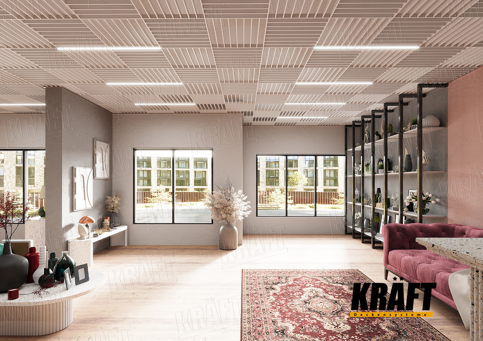 У цій категорії використовуються мінеральні плити або акустичні панелі KRAFT WoodAcoustic, які встановлюються на підвісну систему з Т-профілів KRAFT Fortis.